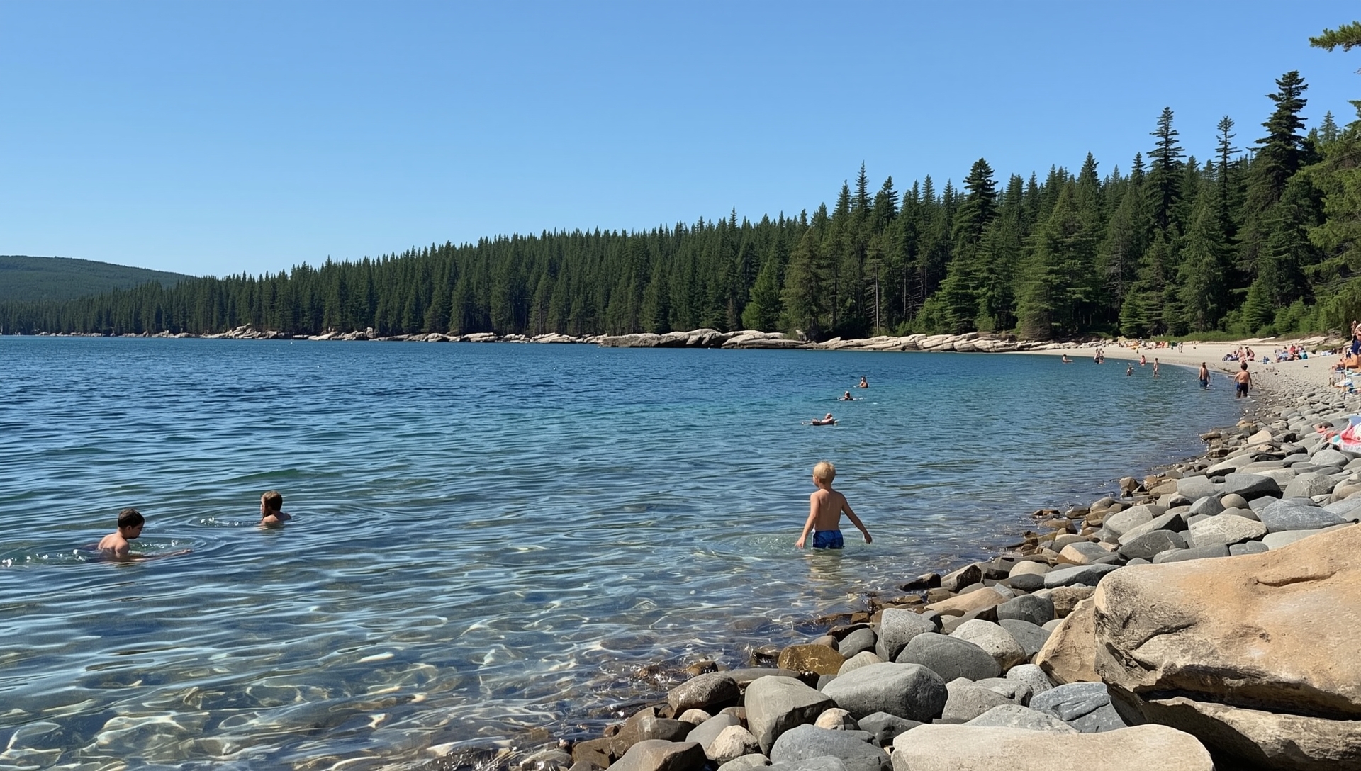 Unlike the ocean beaches, Echo Lake Beach Acadia National Park warms comfortably through summer, often reaching the high 60s °F by mid-season — practically tropical by Maine standards. Families flock here for that reason: kids can wade safely in the designated swimming area watched by lifeguards, while parents lounge nearby with picnic blankets and paperbacks. The lake bottom slopes gently, making it ideal for younger swimmers and anyone looking for a leisurely float.