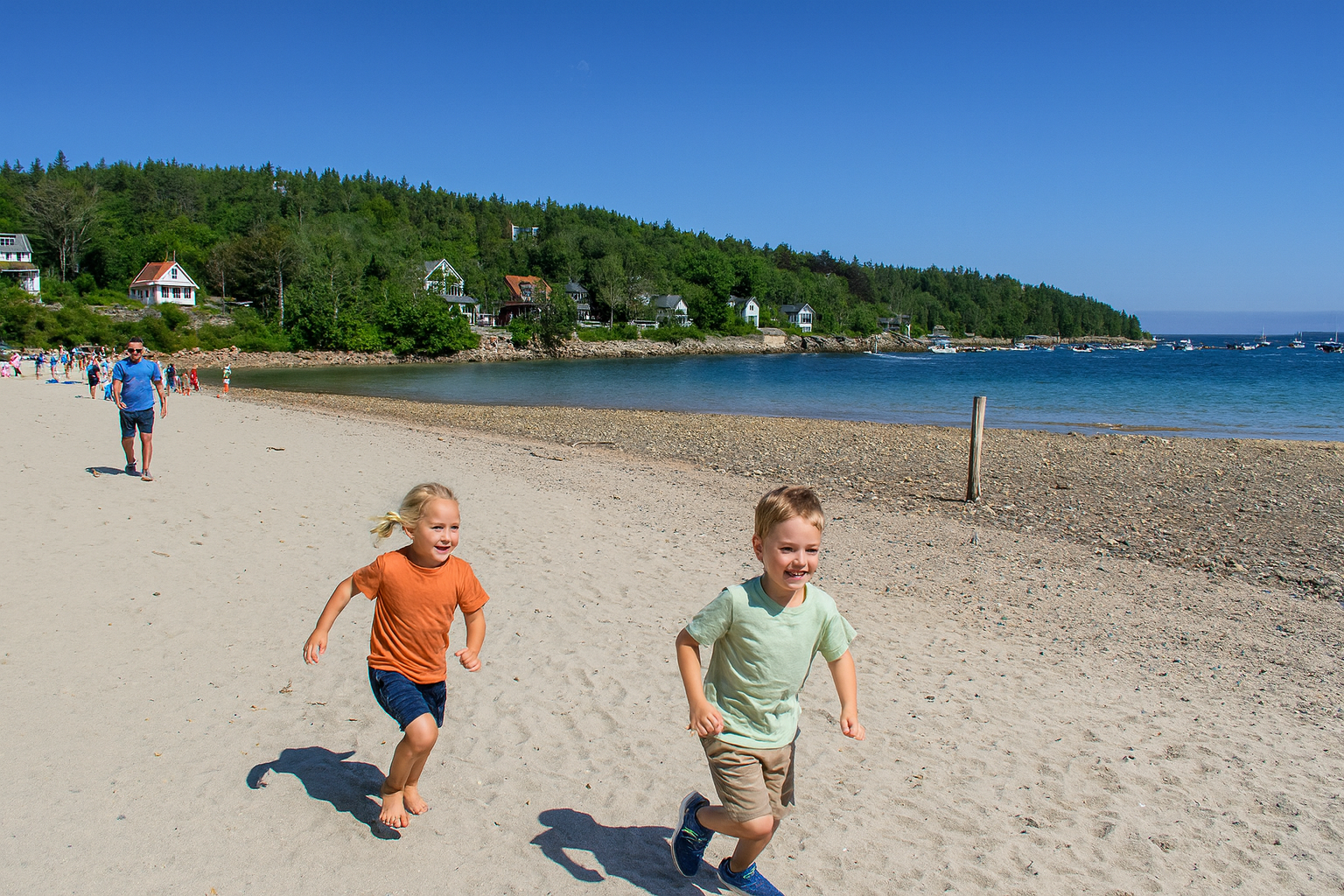 Seal Harbor Beach Acadia National Park is framed by rocky outcrops and shaded evergreens, with views that open toward Sutton Island and the distant outlines of boats crossing Frenchman Bay. The sand is a little coarser and the tide rolls in gently, leaving behind tiny shell fragments that sparkle under the sun. You won’t find big crowds or rows of umbrellas here — just a few scattered families, a couple of kayaks pulled ashore, and locals reading quietly with their feet in the surf.