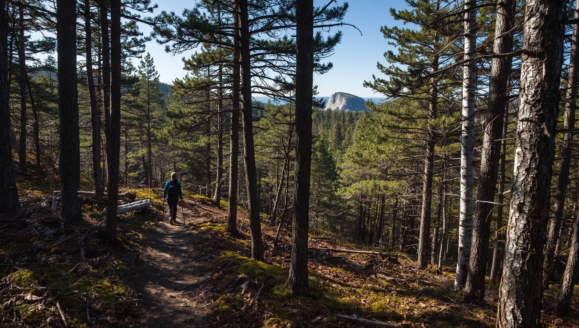 The start of the Alder Trail welcomes you with a gentle transition into shaded woodland, where birch, spruce, and thick stands of alder grow closely together. Their pale, silvery bark gleams against the deep greens of the forest, catching stray beams of light that pierce the canopy. This interplay of texture and tone gives the trail its name — and much of its character. The air feels cool and alive, scented with pine and moss, and the sound of your own footsteps seems softened by the thick layer of needles and leaves beneath. As you follow the path deeper into the forest, the canopy draws closer, filtering sunlight into a shifting mosaic of shadow and gold.