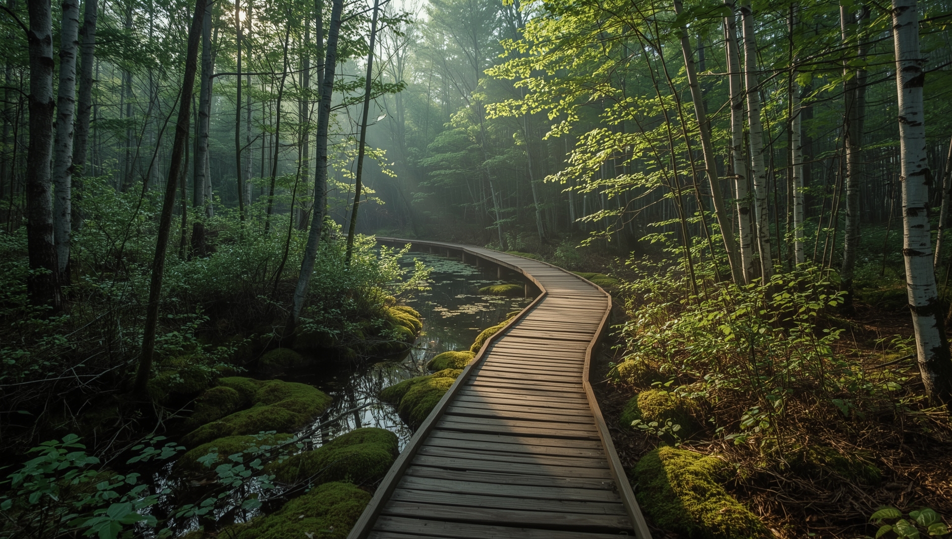 • Features boardwalks, mossy forest paths, and reflections on still wetland pools.