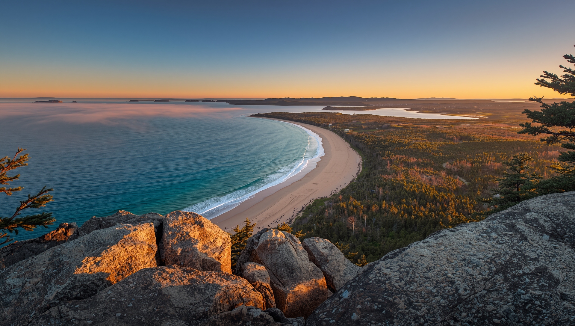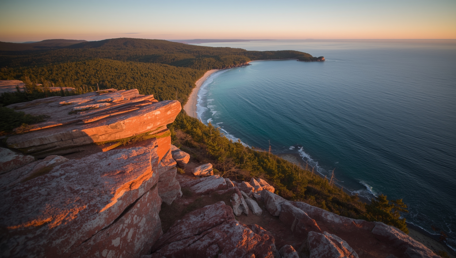 From the summit of Beehive Mountain Acadia National Park, the scenery is nothing short of spectacular. Directly below, Sand Beach curves in a perfect crescent, its pale sand shimmering against turquoise surf that rolls rhythmically toward the shore. To the south, the rugged cliffs of Great Head and Otter Point reach into the Atlantic like ancient sentinels, their granite faces glowing pink in the first light of day. To the east, Frenchman Bay sparkles with the scattered Porcupine Islands, and on a clear morning the view stretches all the way to the Schoodic Peninsula Acadia National Park and even the distant Blue Hill range beyond Mount Desert Island.