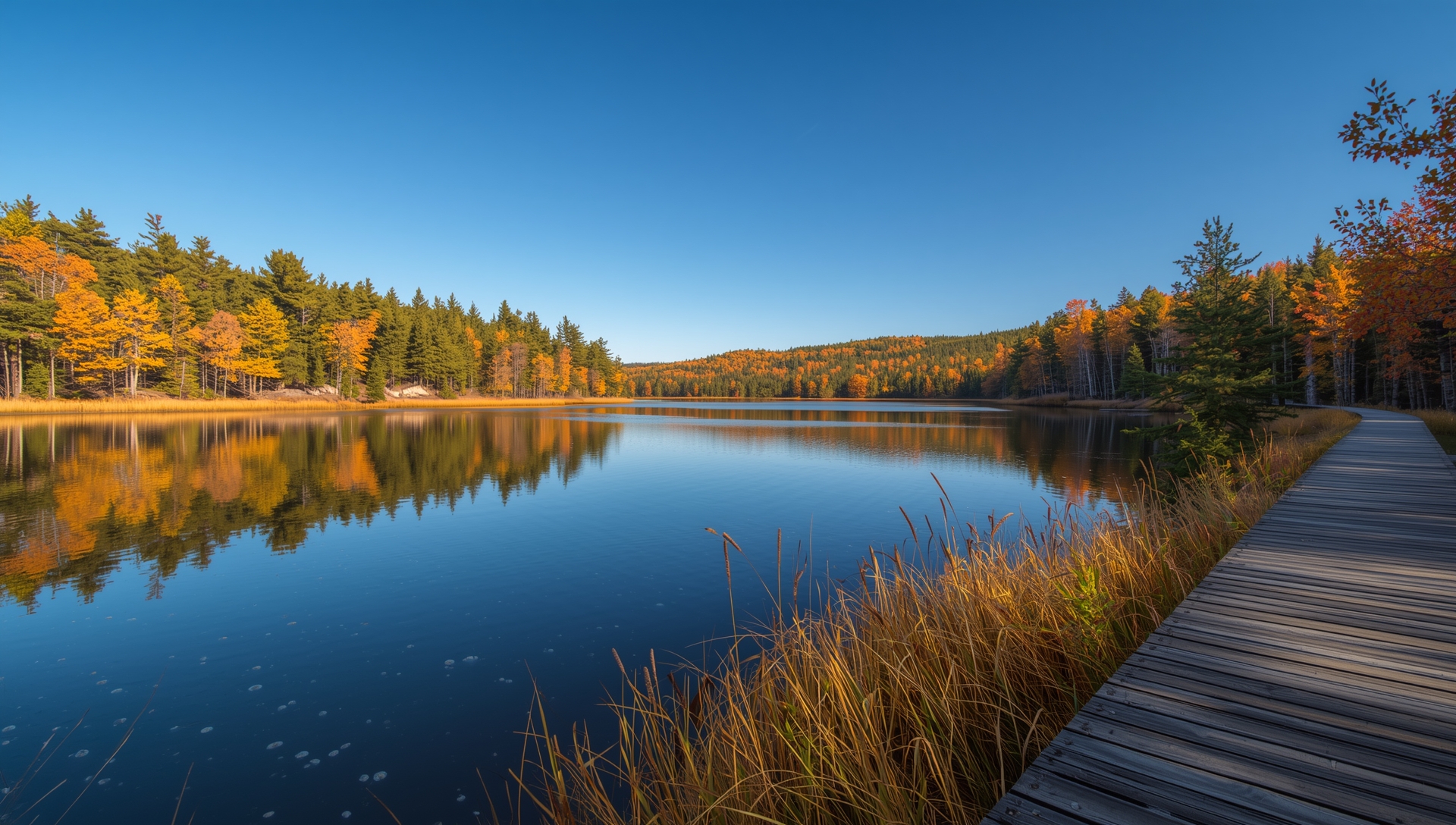 Acadia in the fall transforms the Jordan Pond Loop into a glowing tapestry of color. The slopes surrounding the pond ignite in amber, crimson, and bronze, their reflections doubling the brilliance across the water. The Bubbles Mountains glow golden in the low afternoon sun, and every turn of the trail offers a postcard view. Visitors linger longer this time of year — photographers, painters, and hikers all chasing the same perfect moment when the pond becomes a living mirror of color. The air cools, footsteps crunch softly on fallen leaves, and the light grows warm and honeyed. Even familiar scenes seem new again, reborn through autumn’s quiet fire.