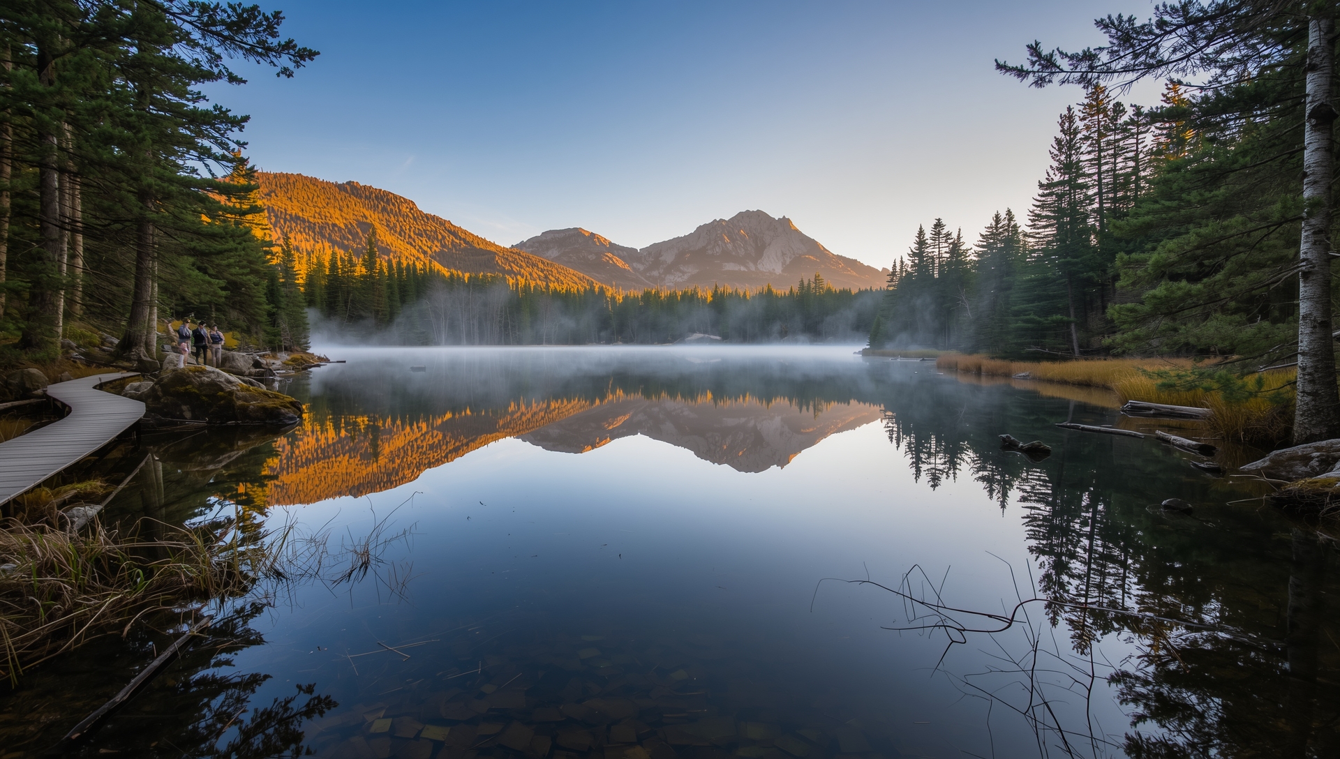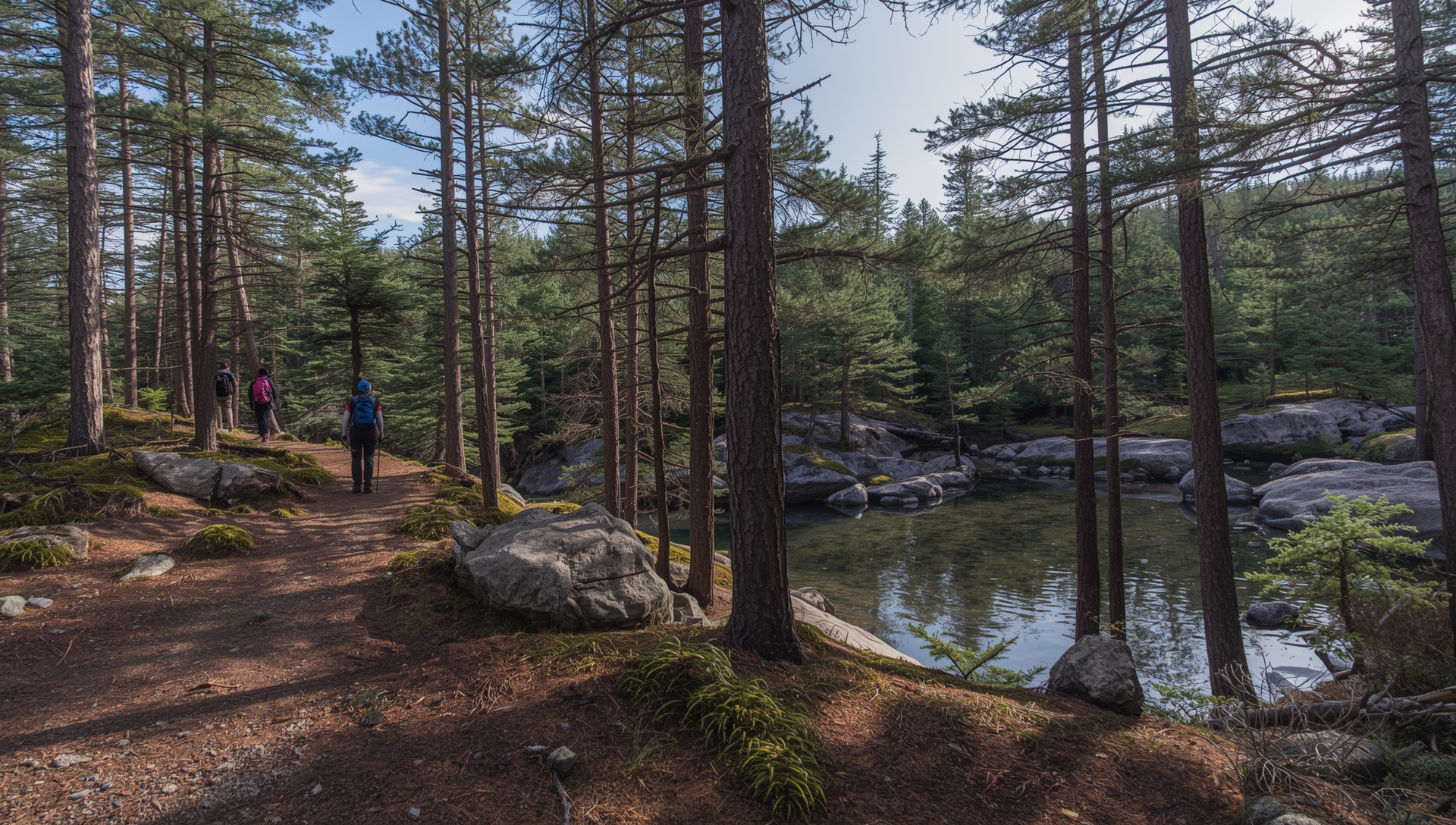 As the path continues north, it slips gradually into forest. The air cools, the light softens, and the surface transitions from plank to granite. The forest scent deepens — pine needles, moss, and damp earth — and the soundscape narrows to the soft rhythm of footfalls and the whisper of branches. A few small clearings appear along the shoreline, ideal for reflection or a quiet rest. Bubble Mountain now rises directly ahead, mirrored in the pond below, their rounded peaks tinted by the changing seasons: vivid green in summer, golden in fall, silvery-blue in winter frost.