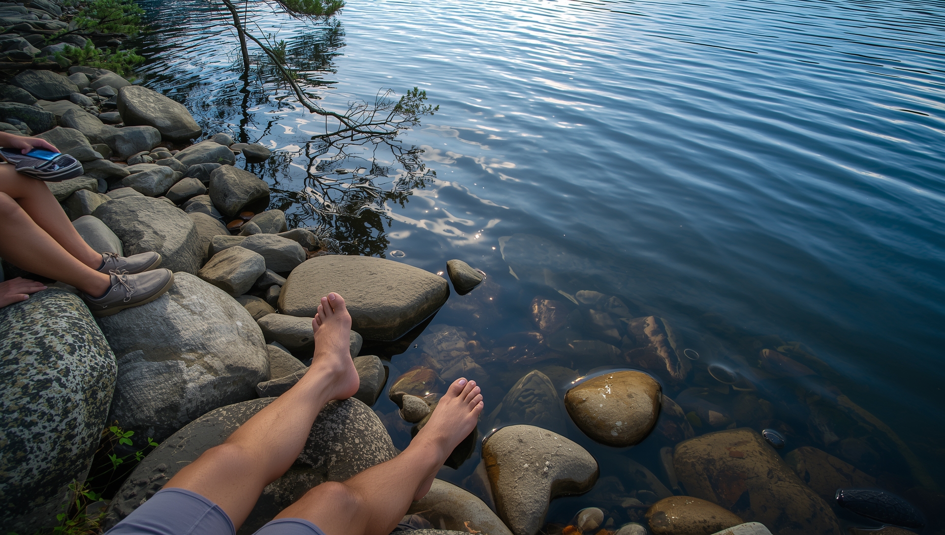 From here, the trail arcs gently south along the western shoreline. The footing is slightly rougher but equally rewarding — rounded stones, soft moss, and the sound of quiet water slipping through reeds. Shafts of sunlight flicker through the forest, casting moving patterns on the path and revealing glimpses of the pond through breaks in the trees. Benches appear at perfect intervals, offering rest and reflection.