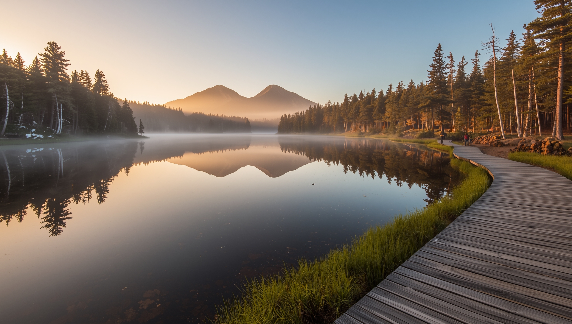 Jordan Pond Trail Acadia is one of the park’s most peaceful and photogenic walks, tracing the crystal-clear edge of Jordan Pond Acadia — a glacial lake cradled between the slopes of North Bubble and South Bubble Mountain. Early light slides down the ridges, spilling gold across the mirrored surface, while spruce and fir trees stand motionless in the calm. From the very first steps, the stillness of the water, the scent of pine, and the quiet rhythm of footfalls on the boardwalk create a sense of deep tranquillity that defines Acadia National Park Jordan Pond at its best.