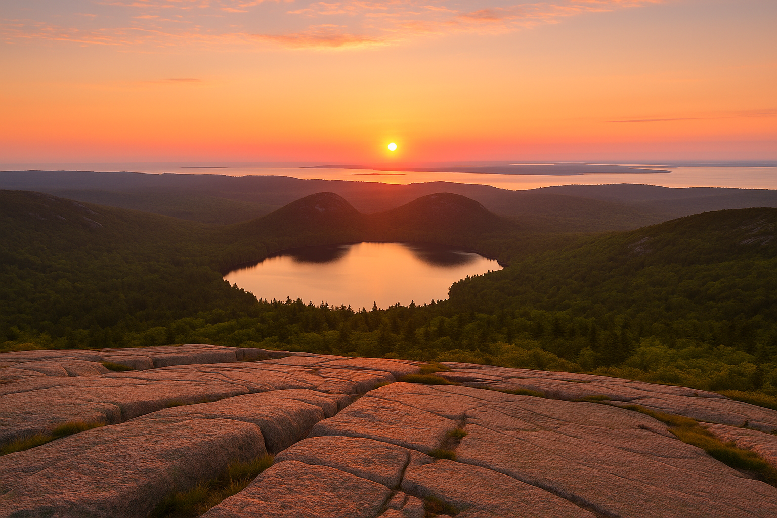 By evening, Penobscot transforms again. As the sun lowers toward the western ridges, the granite dome of the summit bathes in golden light. The long shadows accentuate every crack and ledge, while the forests below take on deeper greens and purples. Jordan Pond, resting at the mountain’s base, becomes a luminous mirror — perfectly reflecting the sky’s amber, crimson, and violet hues. The rounded silhouettes of the North and South Bubbles stand proudly in the distance, glowing with warmth as the day draws to a close.