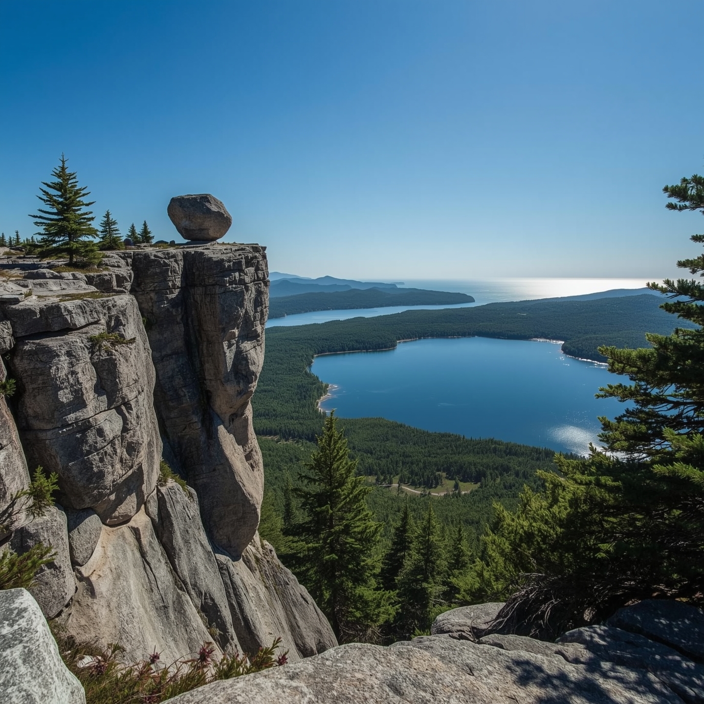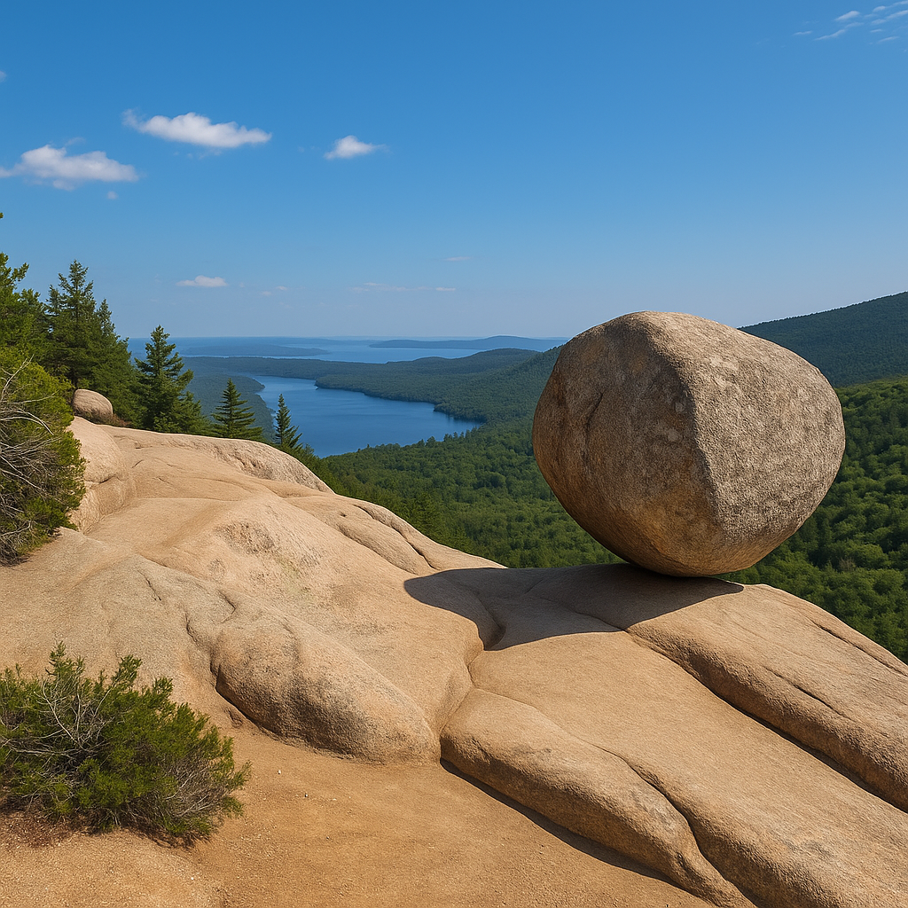 South Bubble Mountain is one of Acadia’s most iconic peaks — not because of its size, but because of the famous Bubble Rock perched on its cliffside. This massive glacial erratic has been balanced here for thousands of years, a dramatic reminder of the power of the glaciers that shaped Mount Desert Island. The climb up South Bubble is short but steep, rewarding hikers with one of the most photographed views in Acadia: Jordan Pond stretching like a fjord below, with the Atlantic Ocean shimmering beyond.