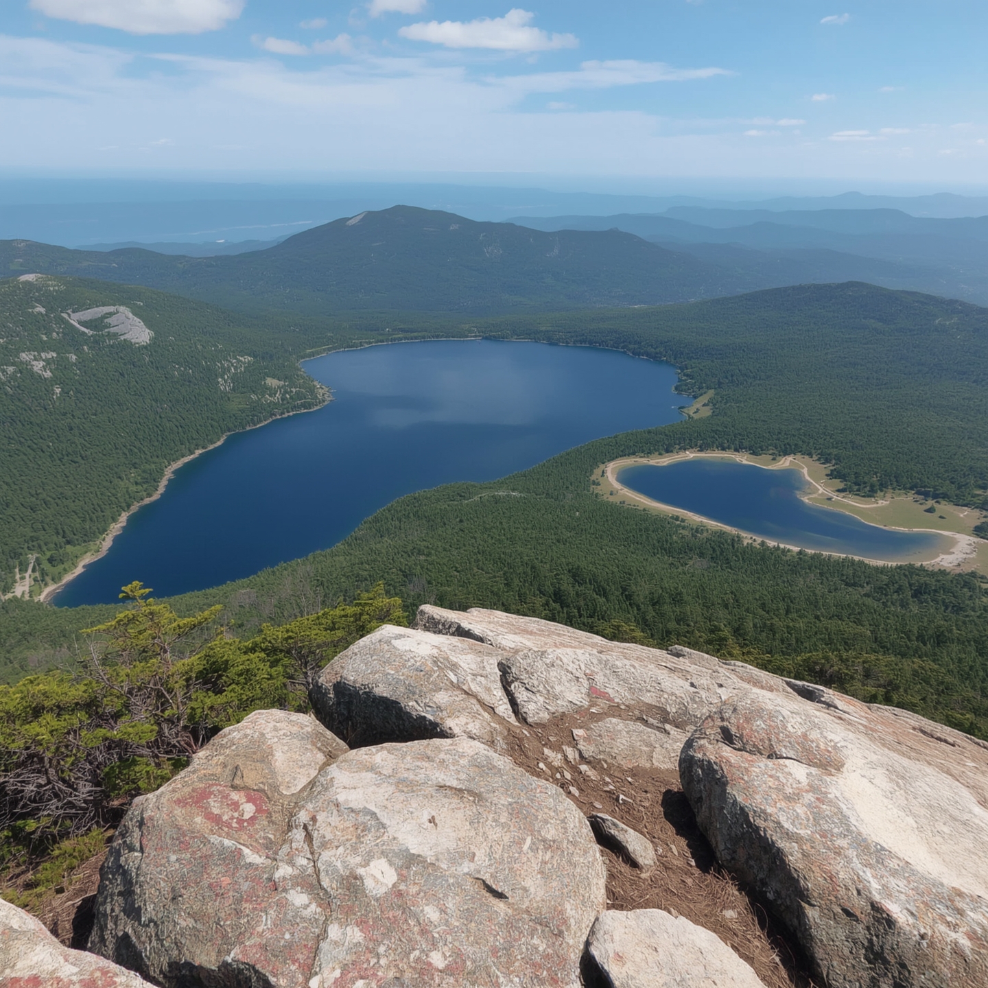 One of the biggest rewards for climbing South Bubble Mountain is the chance to look down over two of Acadia’s most beautiful bodies of water: Jordan Pond and Bubble Pond Acadia. From the summit ledges, Jordan Pond stretches out below like a long, narrow fjord, framed by evergreen ridges and leading the eye toward the ocean beyond. On a calm day, the pond acts like a mirror, reflecting the slopes of both North and South Bubble in perfect symmetry. It’s one of the most recognizable views in the park, appearing in countless photographs, postcards, and guidebooks.